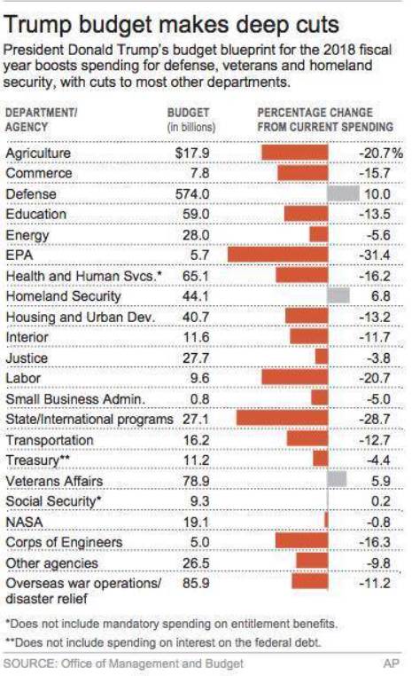 川普上台后,大幅度增加军费预算,同时却大幅度削减了在农业、教育、卫生、环保、科研等方面的预算。增加军费预算也许能给一些美国人带来(虚假的)安全感,但并不能给普通美国人带来多少实际好处。而削减其它开支则可能实实在在地影响美国人的生活及美国未来的国力。比如能源政策——川普为了争取煤矿地区的选票支持,竟然采取“让美国重新烧煤”、回归旧能源而不是开发新能源的政策,这能对美国是好事吗?(再下去是不是要从无人机回到蒸汽机,从Uber回到牛仔骑马?)川普一意孤行要退出巴黎协定,除了取悦否认人类破坏环境造成气候变化的反科学思潮,又能给美国带来多少好处?削减科研、教育经费,对美国的未来又有什么帮助?