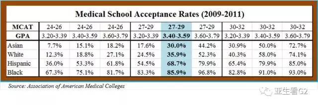 AAMC数据显示,在标准化考试各个分数段,医学院对华人的录取率都是最低的。