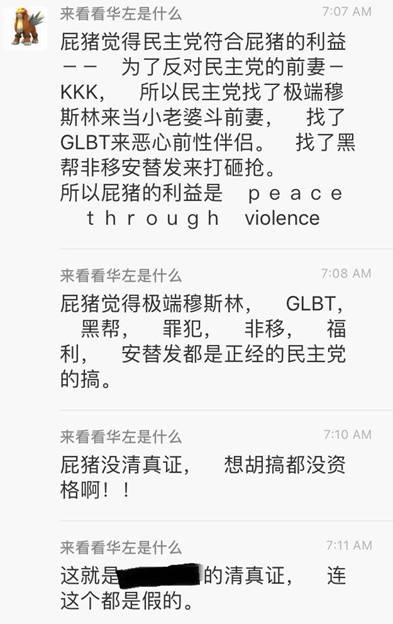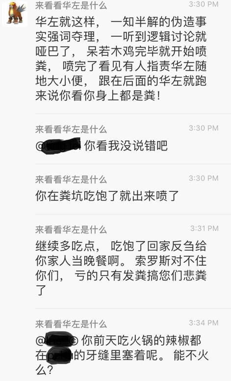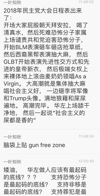 下面是更多“一叶知秋”辱骂华人左派的污言秽语截屏,供读者观赏。吐槽君再次向提供截图的各位忠实读者表示感谢。