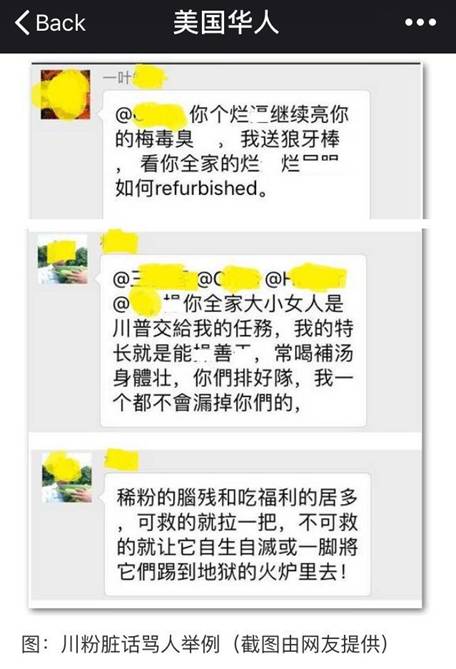 “自大选以来,川粉中的那些恶人,在中文论坛和微信群大肆造谣、骂人、进行网络欺凌甚至人身威胁,逼着那些不敢或不愿骂人反击的异见者都噤声或退群。”