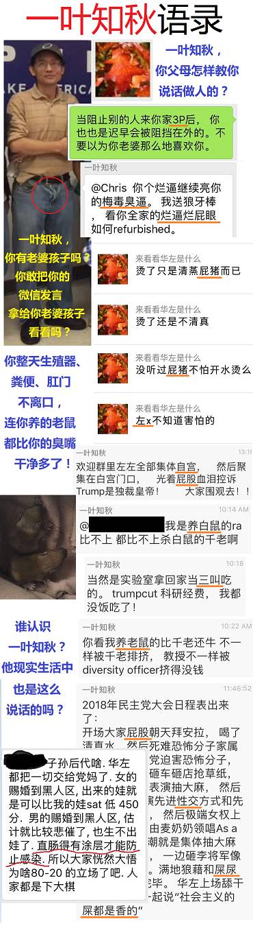 “一叶知秋”是一个例子,是一个代表,是一个缩影。他长期嚣张于猪肉解滨为群主的微信群,充当攻击侮辱华人的旗手。在这些群里面,许多政治观点与“一叶知秋”相异的正义华人被无缘无故踢出群,像他这样的流氓渣滓,却是座上宾领导者,真让吐槽君见识了什么叫物以类聚人以群分。具有讽刺意味的是,通过“一叶知秋”的这些淫秽肮脏、不堪入目的语言,我们足以一叶知秋,窥测到某些华人支持川普是出于怎样的一种变态心理,他们攻击其他华人的手段又是多么下流无耻,他们为了川普不惜撕裂华人社区,严重损害了华人的利益。