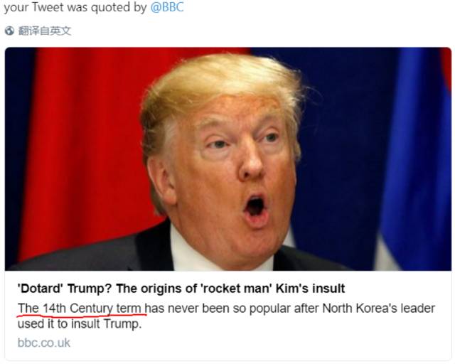 历史上dotard在莎士比亚时代火过,帮助历史小白们换算一下,就是16世纪末。。。19世纪上半页曾再创辉煌,然后寂寂无名,直到这次被三胖考古捧红了。扭腰时报特别发文,这个现下最in网红词汇,从1980年到现在,在他们的报纸上也不过就出现过10次!