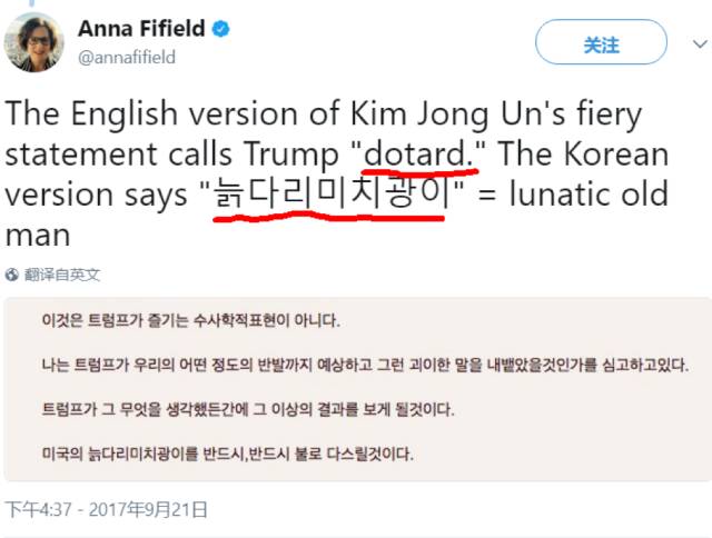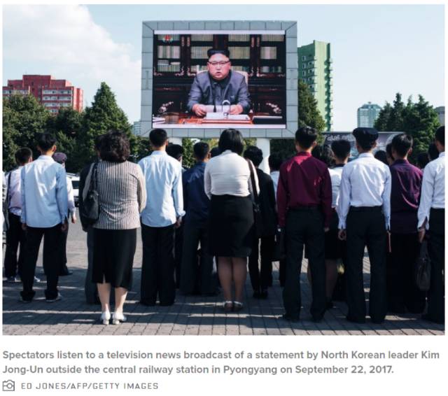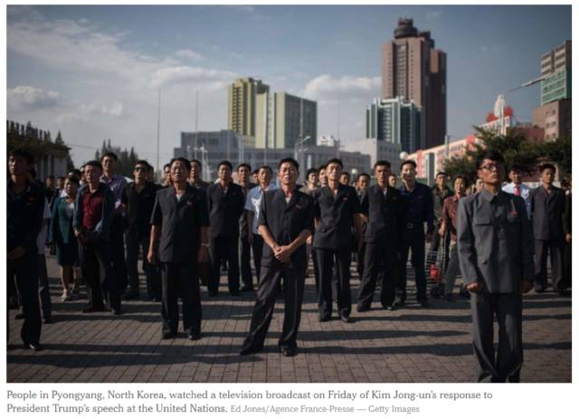 9月22号,周五。平壤广场上的朝鲜民众,一起通过大视频观看金正恩回应川普的联合国讲话。(图片来自网络) 最新斗嘴真人秀是这两天的更新。起因于三天前,川总在联合国大会上讲话的时候,批评朝鲜,还给三胖安了个外号,火箭人(Rocket Man)!讥笑他接二连三或真或假地试射带核弹头的洲际导弹的行为。三胖嘴皮功夫上也从来不是吃素的,且在证明自己喝过洋墨水方面上了干货。反击的时候,甩手扔出一个GRE词库都难摸到边的骨灰级单词,“dotard”。翻译成中文相当于“老糊涂”,立马火成推特第一热搜词汇,刮起一阵热议dotard旋风。