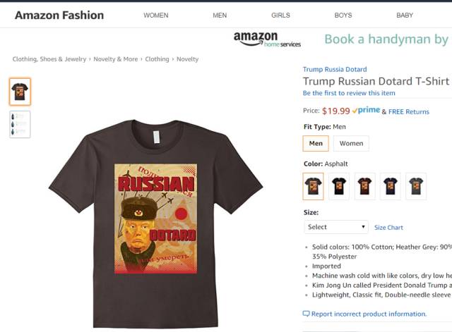 连亚马逊上,都神速推出Dotard川普通俄T shirt,男女款都有。