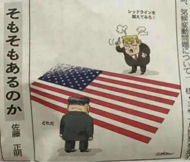 (日本漫画,川普朝三胖喊:你再踏红线试试?!三胖回复,哪根线?图片来自网络)