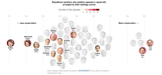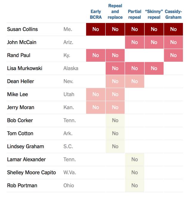 在共和党发起的前后五次推翻奥巴马医保的投票或者计划投票中,投或者表示将投反对票的议员的投票记录。(图片来自纽约时报)