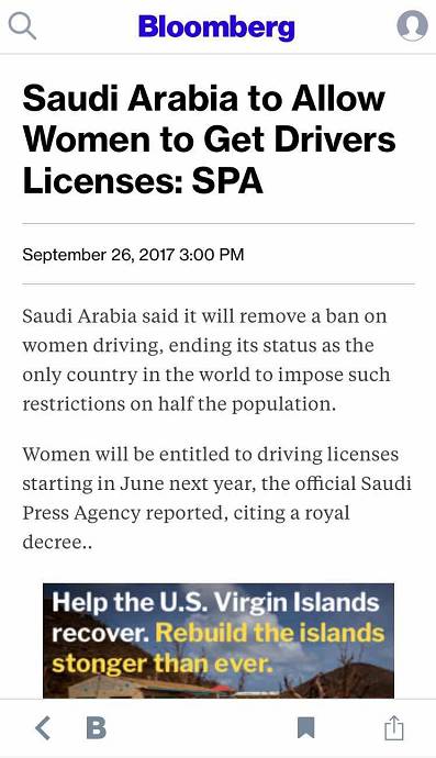 深受自由派喜爱的奥巴马总统,他的重要政绩医保改革,经过千锤百炼留下了根脉。上千万美国民众不用担忧自己失去平价医保的权利。虽然共和党对左派的组织考验从不停歇,但这毕竟是左派的又一次值得庆祝的阶段性胜利。在这个好日子,图姐赠送彩蛋新闻一则。今天进步主义在沙特阿拉伯也冒了个泡。作为地球上唯一一个禁止妇女开车的国家,他们将于明年6月份开始,给女性拥有驾照的权利。