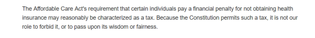 2012年,奥巴马健保以5:4的投票,被最高法院保下。这次官司,确定了一些特定人群被硬性规定 (mandate) 要求买保险,否则将受到税务上的罚款的原则。