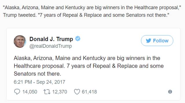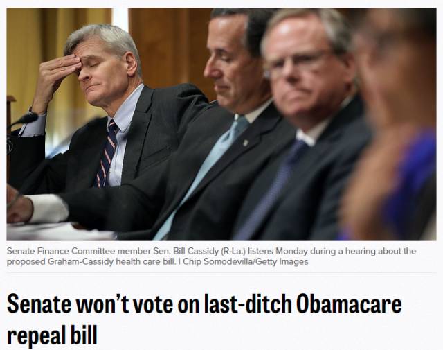 这次旨在抓住最后机会,努力推翻奥巴马医保的Cassidy-Graham议案,因为来自ME(缅因),AZ(亚利桑那),和KY(肯塔基)的三位议员的反对,再次胎死腹中。