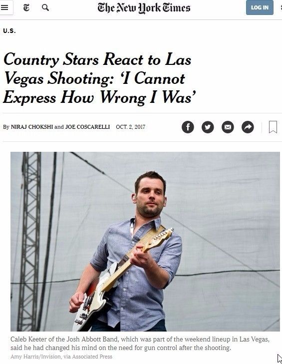 在双方争论不休的时候,枪击案发生时正在舞台上表演的来自德州的Josh Abbott乐队的主吉他手Caleb Keeter发了如下的长推特,表示枪击案改变了他对控枪的态度。