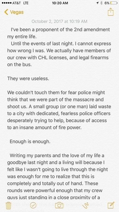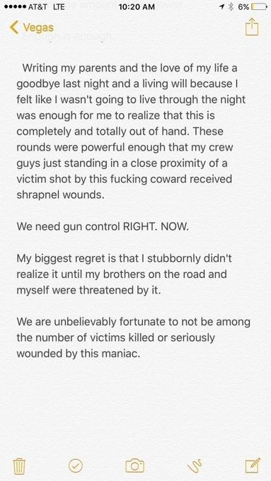 我一生都是第二修正案(注:宪法第二修正案赋予人民拥枪的权利)的支持者,直到昨晚的事件发生。我无法表达我曾经是多么的错误。我们乐队的队员中实际上有人有隐藏手枪许可证,我们有合法枪支放在我们的车里。但这些枪根本没有任何用处。 我们不敢碰这些枪,怕警察会误认我们也是枪手,并射杀我们。那个时候警察正在全力以赴冒死救助,如果此时一部分人为了拿到武器而浪费并影响警察的行动是得不偿失的 ── 就因为一小伙人能够拥有枪支,就能伤害整个城市。