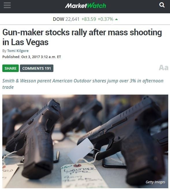 另一个怪异的现象是每当一个支持拥枪的总统上台,枪械制造商的股票会跌。川普竞选时明确支持拥枪,不会加强对枪支的管制。川普上台以后,国会通过法案取消奥巴马时代限制有精神问题的人购买枪支的规定,川普在二月份悄悄地签署了此项法案。但事与愿违,枪械制造商的股票还是不断下跌,像Storm Ruger的股票在川普当选以后下跌了14%。Smith & Wesso也萎靡不振,今年不得不改公司名字为:American Outdoor Brands,试图搞多元化经营而不是集中在枪支制造一个行业。