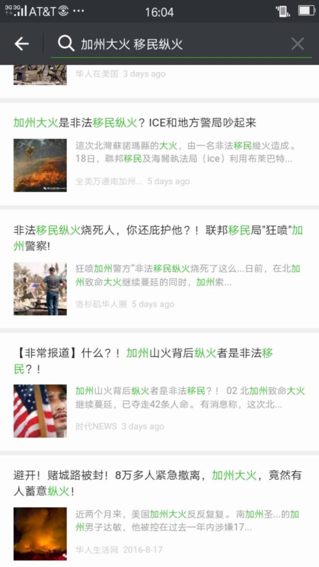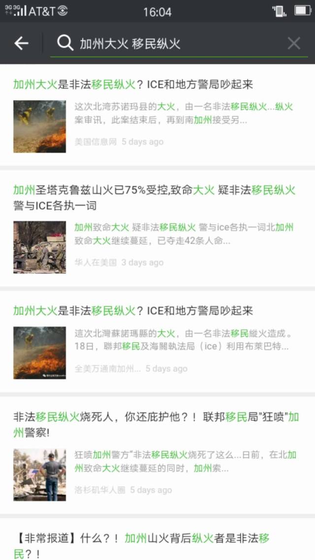 所谓“传谣张张嘴,辟谣跑断腿”。虽然加州消防局的官方消息和媒体报道的新闻每天都在滚动更新,但仍然跑不过小报消息的传播速度。在微信内搜索“加州大火+非法移民”,就会出现如下几篇文章。职业道德尚未完全沦丧的自媒体小编,还会在标题里说一下移民局和加州警察的对喷情节,提示大家这是一个有争议的结论。另外一些耸人听闻的微信文章,则是直接把非法移民定罪为纵火的罪魁祸首。