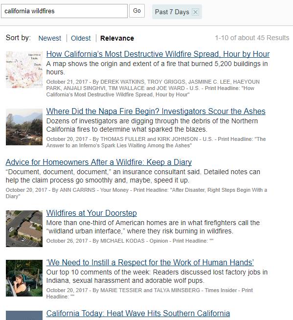 如果你去看传统严肃媒体纽时(NYT)的火灾报道:会发现一来文章数量很多,二来有各种角度,灾情、援助、灾民生存状况等,最近7天就有45篇。