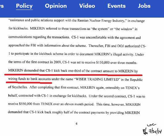 作者在文中,包括标题的主要指控是:“在09年11月,FBI就探知Rosatom公司有吃回扣与洗钱的违法行为,但10,11年,奥巴马政府依然批准它并购和增加进口范围”。