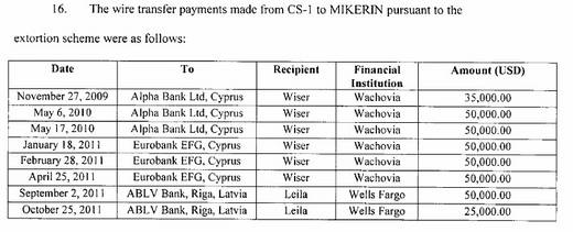 经FBI查明,在09-11年这两年间,Mikerin通过WISER洗钱54万美元,通过LEILA洗钱77万美元,还有一个叫OLLINS的公司洗钱35万美元。除此之外还有少量非正常的现金交易。