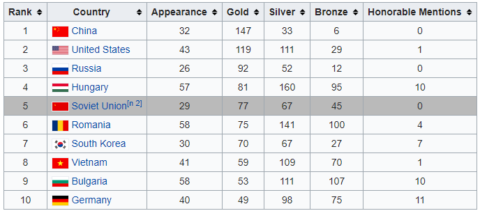 除了团队冠军,中国队“梦之队”在IMO的个人成绩也没有让人失望,自1983年第24届以来,光金牌就拿了147枚,遥遥领先,足足比美国多了28枚!