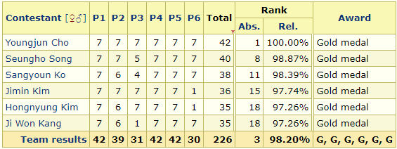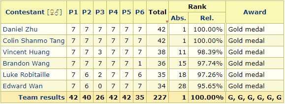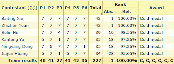 今年有6名参赛者获得个人满分,分别为中国队的谢柏庭和袁祉祯,美国队的Colin Tang和Daniel Zhu,韩国队的Youngjin Cho以及波兰队的Jan Fornal。 总成绩:227