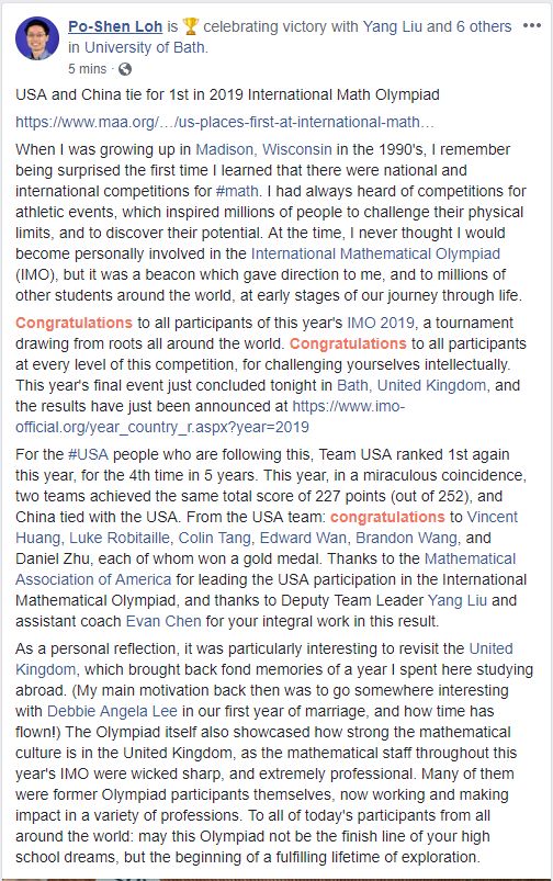 去年,已经进入了数学集训队的他,在今年3月,再次进入数学集训队并以第一名的成绩成功入选国家队,成中国国家队的头号种子选手。