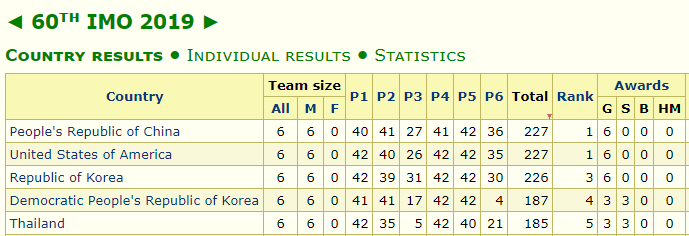 作为全球最负盛名的中学生数学竞赛,IMO每年都吸引着无数学子为之奋斗着。从1959年的七国鼎立,到60年后的百国争鸣,国际数学奥林匹克竞赛在全世界的迅速发展,离不开它高质量的比赛试题和参赛选手们的口口相传。北京时间今天凌晨5点,IMO官方刚刚宣布了所有队伍的比赛成绩。让人意外的是,今年竟然出现了团体双冠军的罕见情形——中国队和美国队分别以227分的总分并列第一!距离上一次出现团体双冠军已经整整过去了20年!