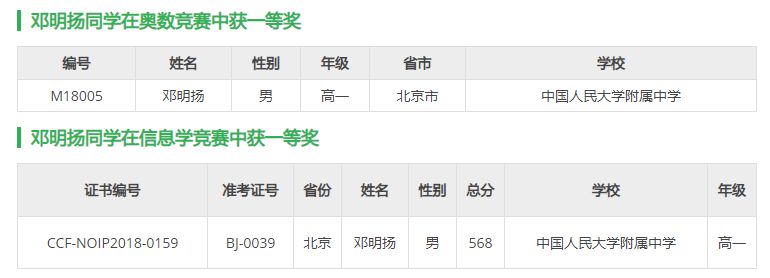 在2018年,邓明扬获得数学奥林匹克竞赛一等奖,并进入国家集训队,并获保送清华北大的资格。更厉害的是,邓明扬还在信息学竞赛中获得一等奖。