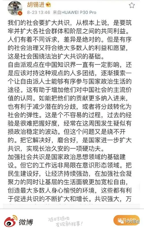 而前一天,胡锡进在微博文章中主张“团结自由派人士”,“逐渐摸索一个让自由派人士能够有序参与国家政治生活的途径”。这是胡锡进难得的一次向右转。