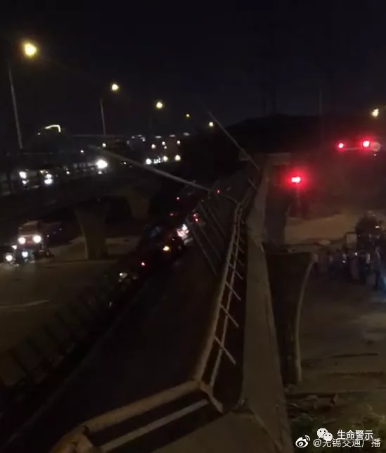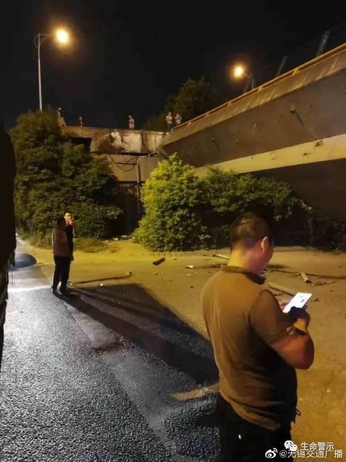 10月10日晚上六点半左右,无锡市312国道上海方向锡港路上跨桥路段桥面垮塌,通行受阻,后方车辆大量积压拥堵。
