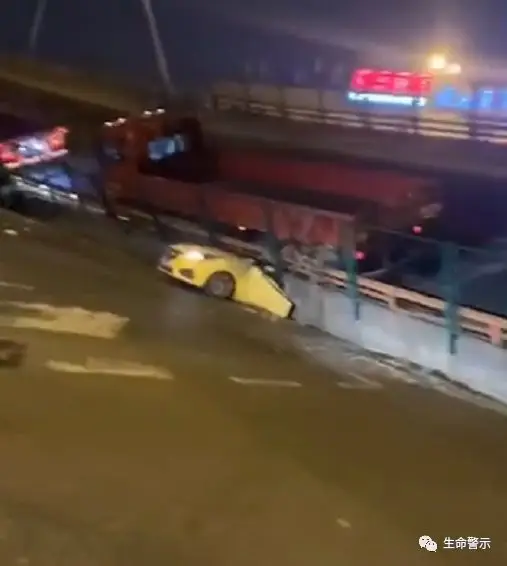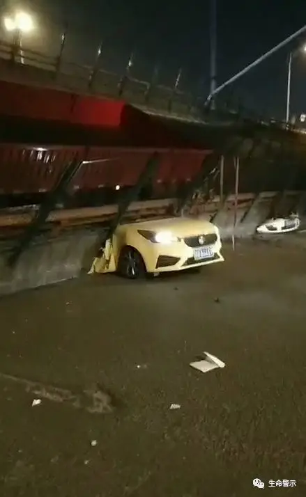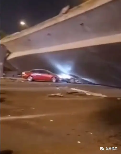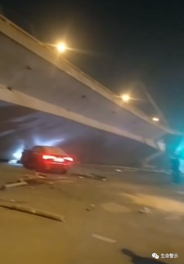 事故现场附近一车辆的行车记录仪拍的高架桥垮塌的惊险瞬间,从视频中看到,多辆轿车在正常行驶中被突然压在桥下。