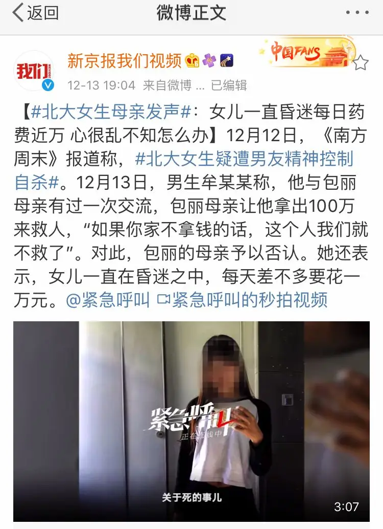 这几乎就是甜甜的爱情小说的开场,但是在今年10月9日,女孩在学校附近的旅馆中服药自杀陷入昏迷,至今没有醒来,已经被医生宣布“脑死亡”。 女孩名叫包丽,她的男友名叫牟林翰,他们就读的学校是中国顶尖高校北京大学。在包丽自杀当天,她在微博上写下“我命由天不由我”,设置成了仅自己可见。短短七个字,充满了绝望!