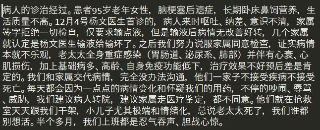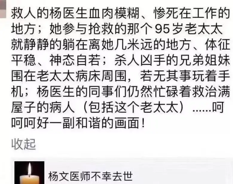 完完全全的无妄之灾。如果用一个词来形容杨文医师,我想大医精诚一点不夸张,她的同事、过往接诊的患者对她几乎交口称赞。在杨文医师去世后有网友发帖本来打算第二天带奶奶去看病,奶奶指名说只要杨文医师看,那个说话很温柔很耐心的女医师。可奶奶不知道这个女医师已经不在了。