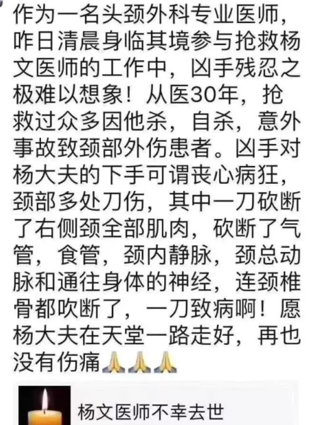 这个案件,有一个很多人不知道的重要情节。 罪犯彭晓亚在带孩子到和平医院之前,曾先到另外一家医院就诊。接诊医生发现患儿家属眼神不对,说话恶狠狠的,且不时语言威胁。医生觉得不对劲,但也没有什么预警方法,就以该院并非专科医院为由劝其转院。患者转到和平医院不久,即发生伤医事件。事情发生后,这名医生庆幸不已,觉得自己躲过一劫。 这一劫,最终落在了没有推诿患者的申雯医生身上。这个精明的医生躲过的一刀,最终刺破了不那么精明的申雯医生的心脏。 杨文医生,本来也可以不死,她死就死在自己太讲医德,死就死在自己太“负责”。 根据网上流传的杨文同事写的文章我们得知: 杨文医生被害案中的患者,是一名95岁的老太太。脑梗后遗症,长期卧床鼻饲营养。12月4号患者到医院就诊时杨文医生首诊。患者来时呕吐、纳差、意识不清,家属签字拒绝一切检查,仅要求输点液。输液后无好转,就一口咬定是医院给治坏了。 杨文必须死,因为温柔而负责的她,本着医者的仁心和善良的天性收治了这样一个所有医生都一眼看得出风险的定时炸弹式患者。 杨文必须死,因为她毫无风险意识,面对一个95岁风烛残年奄奄一息的老人,她没有为了规避风险而硬着心肠将病人推走,而是选择了收下来积极救治。 杨文必须死,因为她太善良了太温柔了太负责了。 杨文必须死,因为这么一个善良温柔负责的不怕苦不怕累不怕风险的好医生,根本就不配活在这个世上。 杨文的死,会给全国的医生一个痛入骨髓的深刻教训。让他们明白以后在面对类似患者类似家属的时候,应该做出什么样的选择。杨文的死,会让无数的老年危重患者成为医生脚下的人形皮球,在各个医院间来回奔波。 别说这些医生没有医德,他们只是想好好活下去。 杨文医生本来可以不死,她死就死在太乖巧听话,太信赖医院和组织。 杨文和同事努力说服家属同意检查,发现患者全身肿症感染,伴有心衰和心肌损伤。患者合并多种基础疾病多,高龄,自身免疫功能低下,预后极差。然而家属根本不听不信不理会,无休止的在医院吵闹辱骂威胁。其中患者小儿子尤其极端和情绪化,总说如果老太太死了谁都别想活。在长达半个月的时间里,包括杨文在内的急诊科医生上班都提心吊胆。 杨文和同事将患者情况向医院上级部门进行了反映,据说还报了警。医院提醒她们注意安全。 然后,就没有然后了。 再然后,就是杨文医生在21世纪20年代即将来临的一个凌晨,在太阳马上就要升起的时候,在连夜辛勤值班抢救病人的时候,在奋笔疾书书写病历的时候,被自己殚精竭虑救治的患者家属用一把罪恶的屠刀,夺去了自己的生命。 有人说她不该背对病人,笑话,面对一个蓄意行凶的持刀歹徒,你不背对着他就能逃过一劫了? 从凶手发出死亡威胁到动手杀人,长达半个月的时间里,她没有得到医院和警方任何有效的保护。在长达半个月的时间里,她和同事背无数次的辱骂威胁,她没有得到医院和警方的任何协助。 杨文医生之死最令人寒心的地方,不是她哪方面做的不好,而恰恰在于她什么都没有做错。 在生命受到威胁的时候,她选择了相信医院相信上头,作为一个医生,作为一名员工,作为一个公民,她已经穷尽了体制内所有法律和纪律所允许的自救的手段。而结果,是她不可避免的走向了死亡。 如果杨文不是一名普通的医生,她大概不会死。 如果杨文是民航医院的领导,那么,在她生命受到威胁的时候,大概分管安全保卫的医院领导会安排人24小时保护。可惜,她不是。甚至,不用24小时保护她,只要医院在收到明确的杀人预警后,有针对性的在急诊科配备保安24小时监控,她也不会死。 如果杨文是某个对职工的生死更负责任的医院的医生,她大概也不会死。 曾经,我们医院也有医生受到死亡威胁。在有关部门难以采取有力措施的情况下。我们医院保卫科为当事医生配备了24小时保安保护,直到事情解决警报解除。而杨文,在穷尽了自己的自救措施后,只能孤身一人默默的迎接死亡。 如果杨文是一名不那么死心眼的医生的话,她大概也不会死。 如果她不那么温柔听话,而是取领导那里哭闹撒泼一番,大概率领导会采取更积极的措施。如果她不那么遵守劳动纪律,在受到无休止的侮辱恐吓和生命威胁后想办法给自己开个假条躲起来休假,那她大概率也不会死。或许还会有人死,但不会是她。 如果杨文不那么守法的话,她大概也不会死。 有朋友告诉我,北京的某家医院,很多医务人员在受到威胁后已经开始去找“三哥”。有什么混人闹事,给三哥打个电话派几个兄弟过来,没有解决不了的事情。 医生这个行业,没别的好处,就是认识的人多。杨文从事医疗工作二十多年,如果她愿意,不难结交几个二哥三哥,但她没有。她相信医院,相信领导。 于是,她死了。 她仁心仁德,她遵守法律,她相信组织,她尊重领导,她服从纪律。所以,她死了。 死了也就死了。时间永是流逝,街市依旧太平。无论多么大的悲伤和愤怒,在不久之后都会被彻底忘记。除了孤儿寡母,除了白发爹娘。 今天的民航医院急诊科,人潮涌动,已经见不到半点鲜血的痕迹。 几年前,我曾经到外地会诊一名国企伤员。因为其他员工违章操作导致他被大面积烧伤。 在会诊时候我得知,这名伤员,是这家百亿级别企业几年来首例重伤事故。我不由得惊叹企业安全保障竟然如此得力。接待