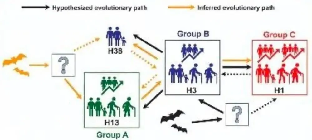 那为什么台湾专家和众多现在流传很广的自媒体文章完全没有提及H13也来自武汉啊!这是为什么?我不能明白! 另外,不是说美国“五毒俱全”吗?其实除了H38之外,美国还有一例H35,大家看图,H35属于Group A,辈分极高! 论文说,这例来自美国亚利桑那,仅有一例。