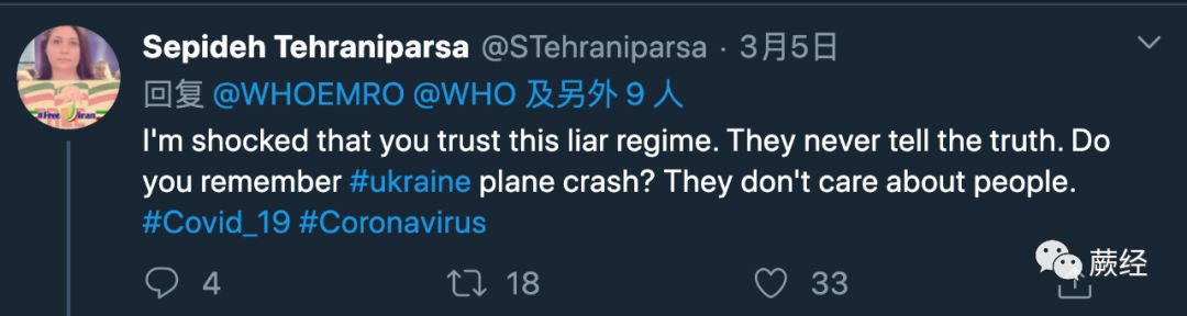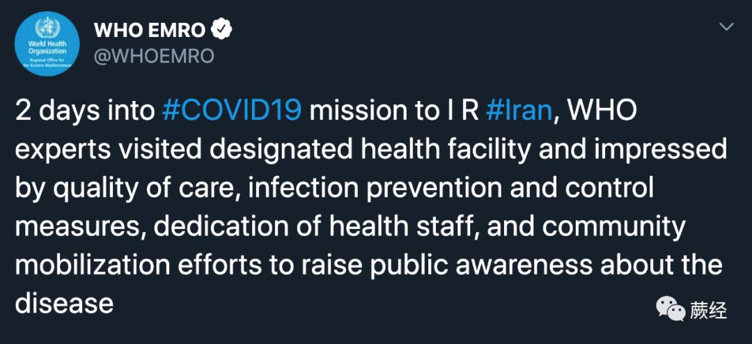 其实不仅对于中国的网页展示,WHO在某些其他地方也开始被强烈质疑。这两天WHO一个帖子说去伊朗进行新冠肺炎视察之后对当地的高品质医护、传染控制与手段之高效、医护人员的尽职尽责、公卫意识提升的动员能力等等留下了深刻的印象。但这段四平八稳政治正确到极点的官方言论被评论前赴后继地批评或讥讽,这情有可原因为这实在和伊朗在疫情中展现出来的种种数据和客观细节不符合,应该说太不符合了。