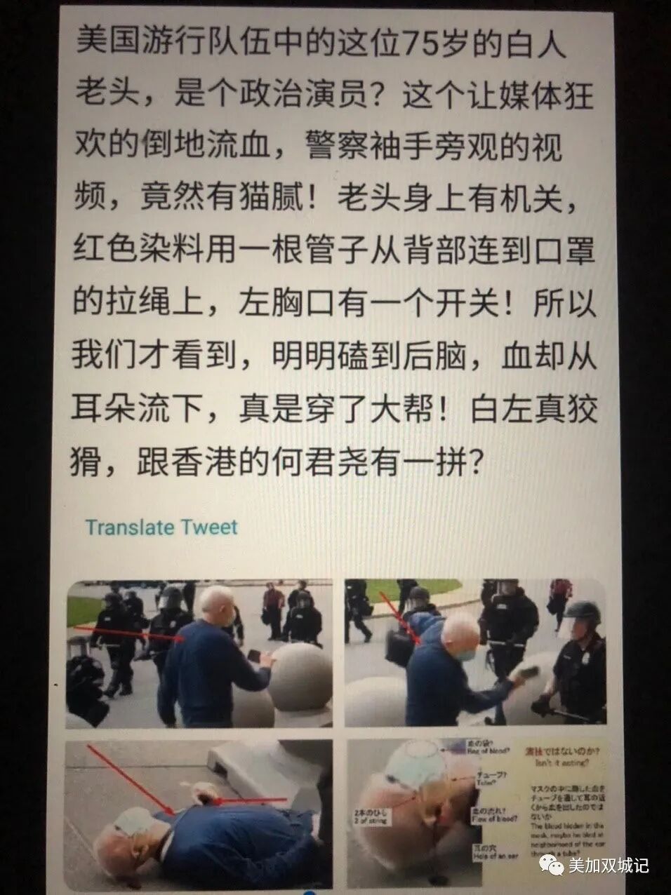 随后,一个移民德州的华人,发给我们一张图,说真实情况是这样的:这个老头是政治演员,这一切都是事先导演的,是碰瓷,血是假的,从口罩里流出来的…… 这番解释让我惊愕,光天化日之下,那么多摄像机从不同角度拍下的视频,还能被这样解读,我也是无语了。在美国,这种阴谋论看的太多,见怪不怪,我一笑而过。 本以为此事就这么着了。 昨天一早,就被川普的推特惊呆了。他说,这个老头是“反法西斯”极端左翼的成员,被警察推倒受伤是“导演的”。 这个推特,真是炸到让他的铁杆支持者都哑口无言了。 记者把这个推特打印出来,想念给支持川普的共和党议员听,他们的反应是,我宁愿不听。 因为事实、逻辑、伦理……所有人类社会的底线,都被他这条推特突破了。 这时,我想起那个华人朋友发我的真相图,详解老头如何自导自演的,跟川普的脑回路一致,发出来给大家开开眼界。