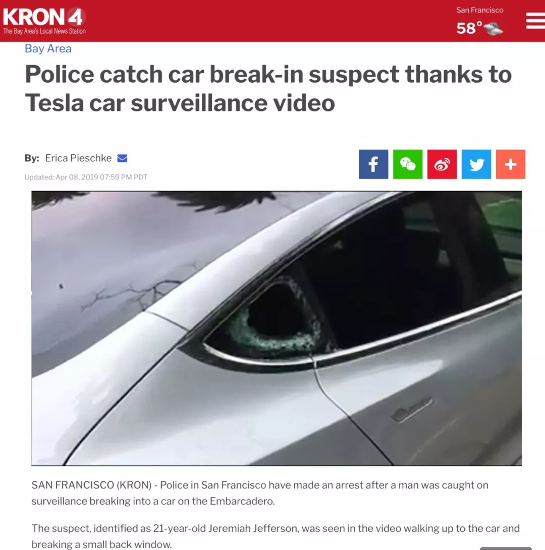 根据KRON 4电视台报道,21岁的Jeremiah Jefferson砸破一辆停在旧金山路边的特斯拉3型汽车的车窗行窃被这部特斯拉的自动监视系统录了下来。警方据此视频逮捕了这名疑犯。现这名疑犯被关押在郡监狱。(KRON 4报道截图)
