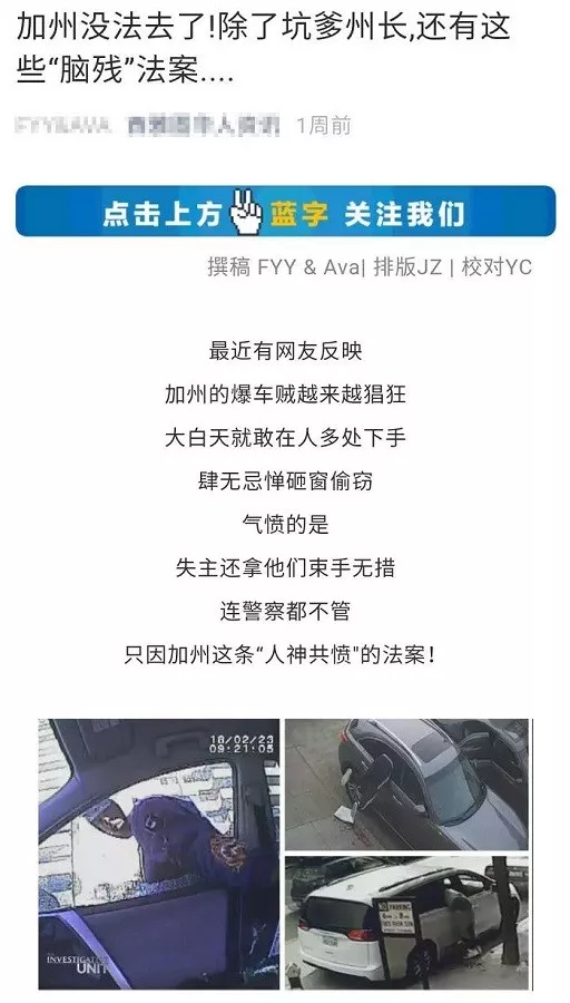 据说旧金山湾区砸车盗窃案件频发,于是一些中文自媒体从中获得了灵感,声称民主党通过了一个“奇葩加脑残“的法案——偷窃抢劫950美金以下不算犯罪,警察不抓,报案也没用。