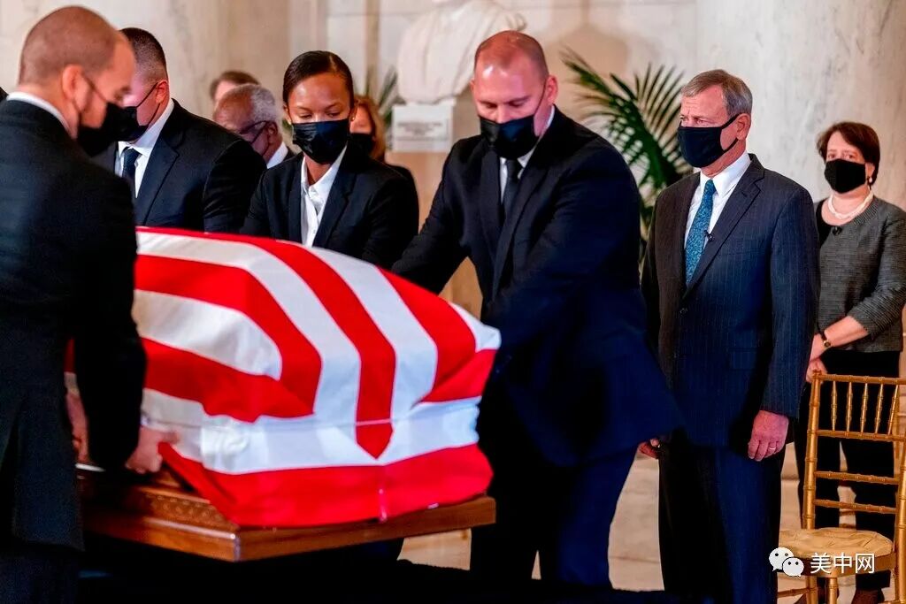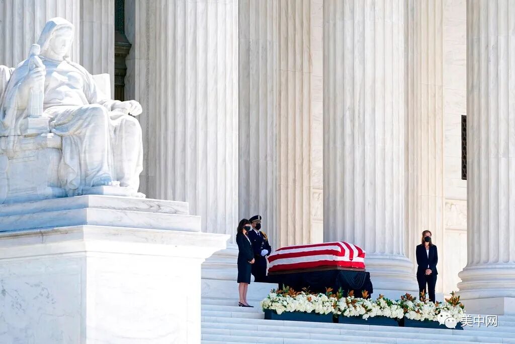 仪式结束后,金斯伯格的灵柩被移至最高法院大楼前台阶上方的门廊下,将在那里摆放两天,供公众在户外瞻仰。公众可以在周三以及周四表达敬意。
