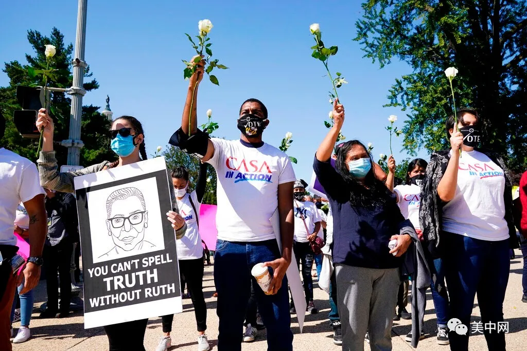 一位女性举着的标语写道:“感谢RBG做的一切,来自一位美国同志”。一些人则戴着写有“投票”字样的口罩,鼓励人们在11月大选中踊跃投票。还有哀悼者穿着写着“Notorious RBG”字样的T恤,上面的金斯伯格画像上戴着王冠,这一名字来自90年代的黑帮说唱歌手Notorious B.I.G.,金斯伯格已经成为流行文化偶像和美国的象征。