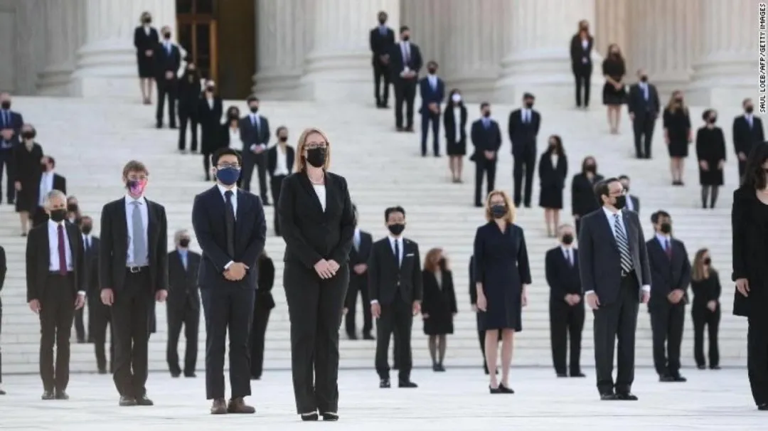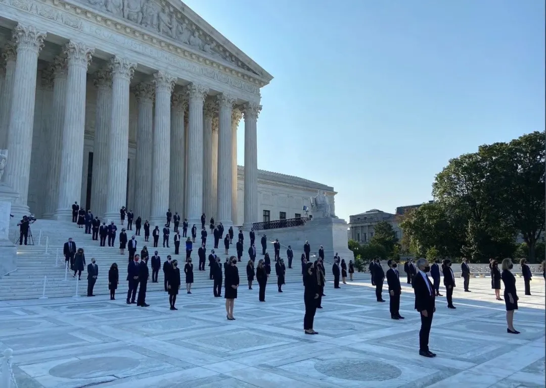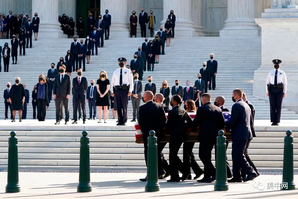 金斯伯格的灵柩在周三上午9点30分前抵达最高法院。金斯伯格生前有过100多个助理(law clerk),全部到齐在最高法院的门口告别她的遗体。场面壮观、感人。
