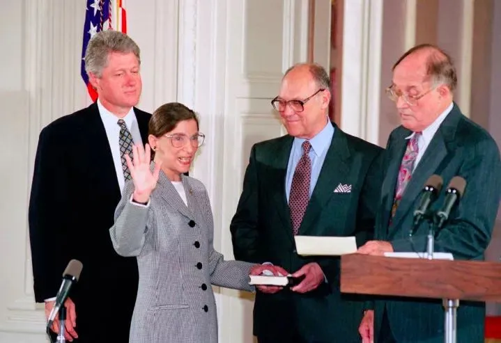 1993年8月,在白宫东厅举行的宣誓仪式上,金斯伯格在首席大法官威廉·伦奎斯特(右)的见证下宣誓就任。