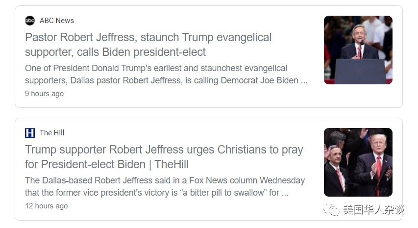 另一个重大新闻:德州超级教会之一的达拉斯第一浸信会罗伯特·杰弗里斯(Robert Jeffress)牧师,一直是川普最忠实的福音派盟友和辩护人,几日前在福克斯新闻专栏中,呼吁川普的支持者,承认当选总统拜登的胜利,并称这是一个"表明基督徒不是伪君子的机会"。