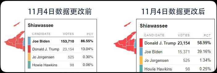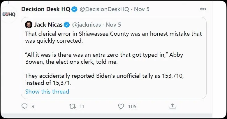 马特·麦科维亚克首次发布的相关推特 推特所引截图来源自无党派新闻数据分析网站Decision Desk HQ(简称DDHQ),DDHQ从各级政府计票网站抓取数据,多家传媒都会用DDHQ的数据来更新自己的开票网站页面。 这个计数错误来自于密歇根州Shiawassee县的票数。原本数字是特朗普在该县以25,154票对15,371票领先拜登,但是录入人员上传数据时加了一个0,于是增加的票变成了153,710-15,731=138,339。密歇根州拜登总票数变成了2,130,695(1992356+138339=2130695)。工作人员发现了这个错误后立刻进行了修正,DDHO也随即进行了更正,并在推特上澄清。