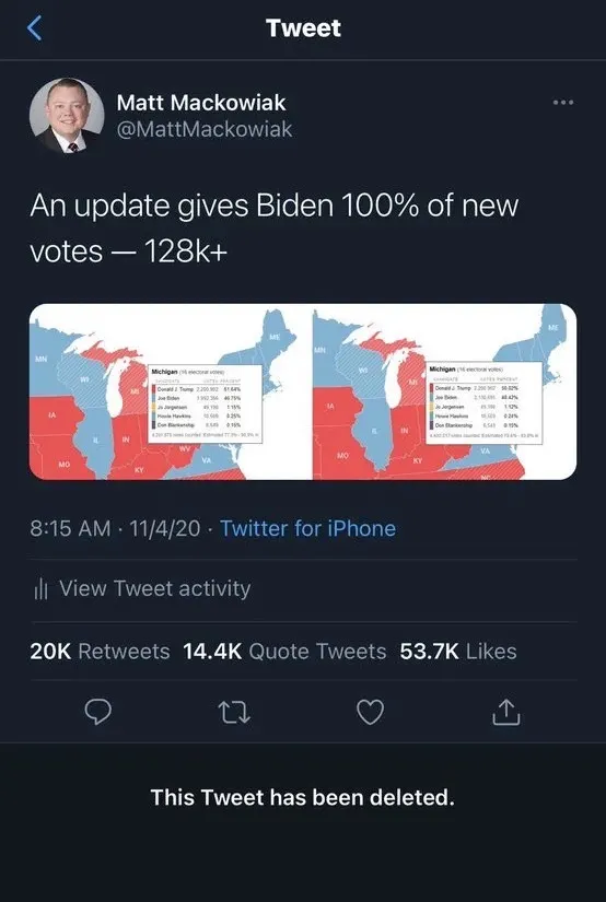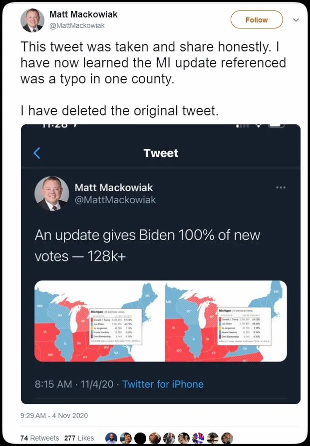 马特·麦科维亚克表示自己认识到密歇根州的更新是来自一个数据上传手误,因此删除了原帖