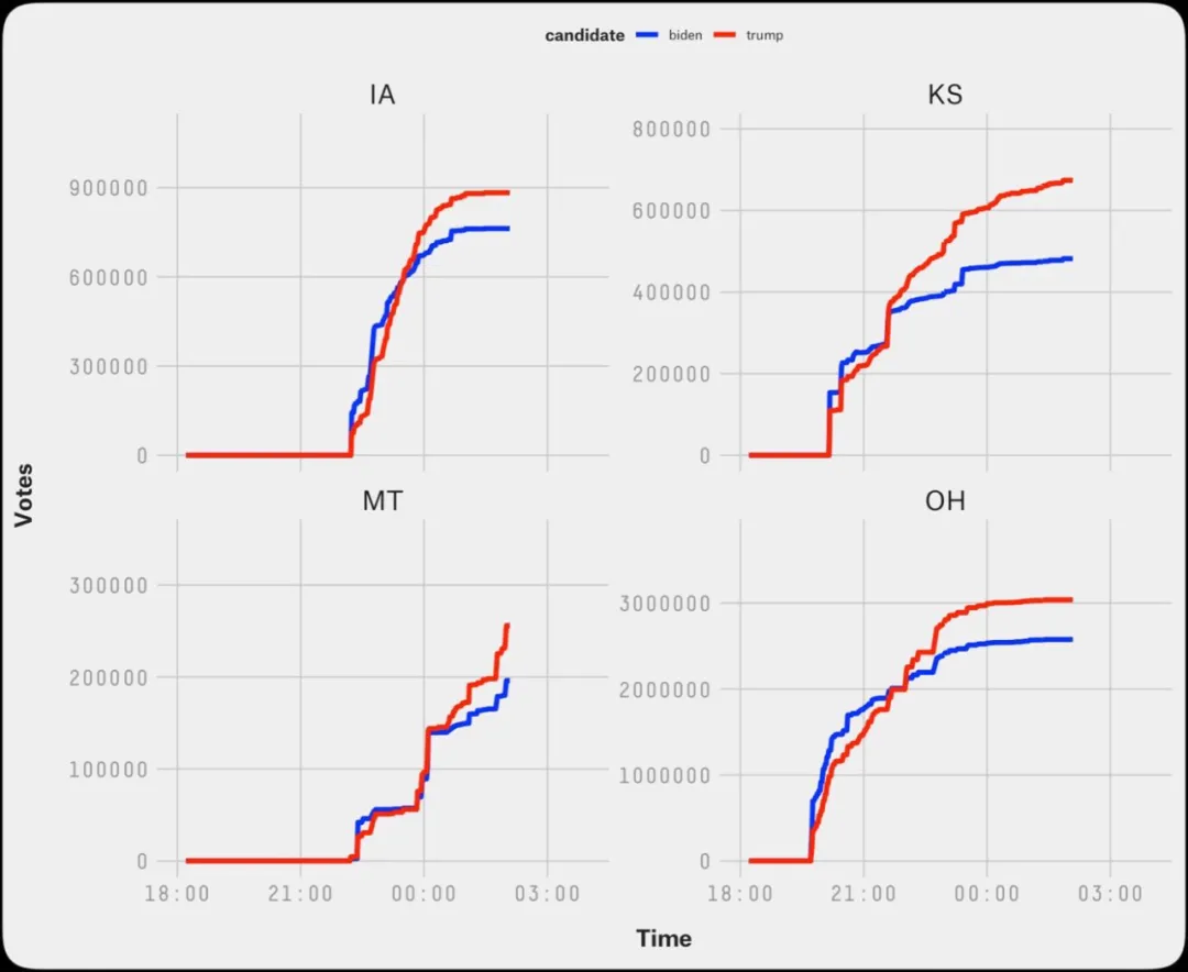 爱荷华,堪萨斯,蒙大纳,俄亥俄等州在计票过程中都出现了突然跃升情况18