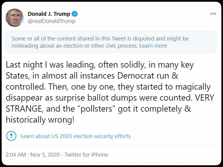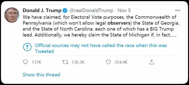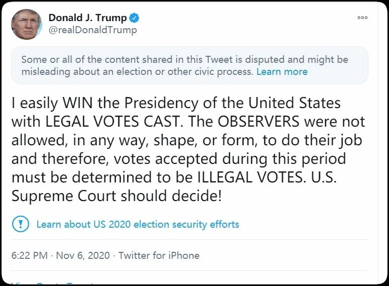 在推特中,特朗普声称监票员受到阻挠,因此无法以任何形式完成检票工作,并且在另一条微博中重点强调了宾州阻挠合法监票员工作。