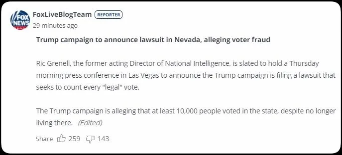 这项指控由特朗普竞选团队于11月5号,在拉斯维加斯竞选总部外的新闻发布会上公布。团队表示将发起诉讼,以确保只有“合法的”选票被统计。团队同时表示,有至少1万名不居住在内达华州的人在内达华投票。8