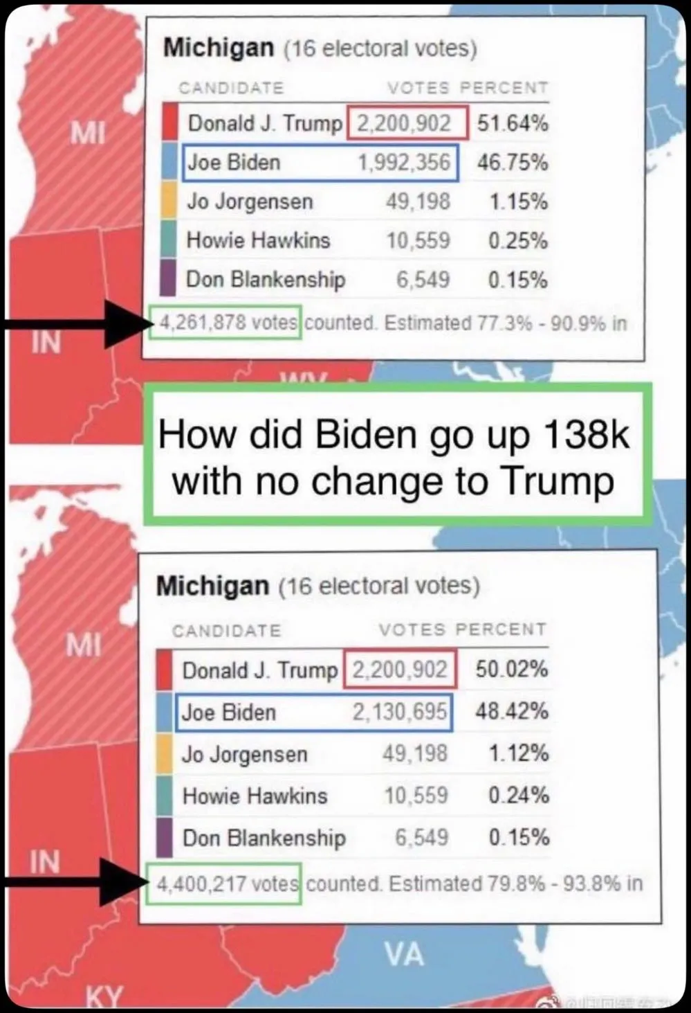 事实上,因为摇摆州红蓝郡开票时间差异,以及所开票类型的区别,美选出现这样的开票趋势并不奇怪,早在选前就被不少人准确预判。桑德斯在选前还专门指出这种趋势会造成的潜在危险。13 并且,关键摇摆六州,乔治亚州和亚利桑那州州长和议会皆是共和党,宾夕法尼亚州,威斯康星州和密歇根州有共和党立法机构,只有内华达的州长和议会皆为民主党控制。并非如特朗普所说皆为民主党掌控。 不过虽然采访没有提出相关证据,网上确实流传着11月四号凌晨4点拜登选票发生了不正常暴涨的流言。以下是流传最广的两则: A 密歇根州连夜增加了十几万张选票?