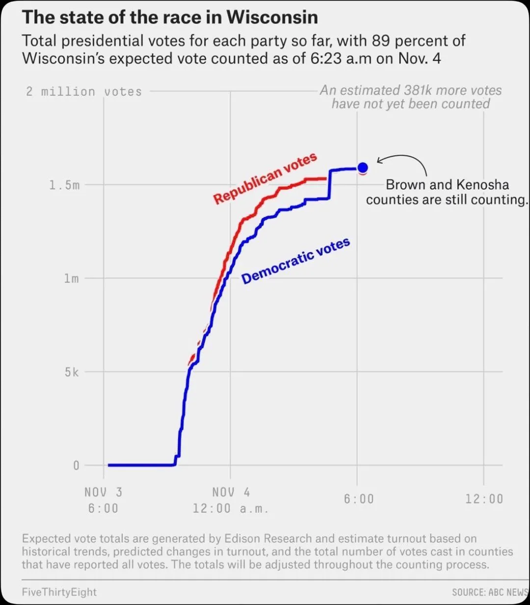 该图为真,但解读有误。拜登票数突然暴涨是因为美国大选计票结果分阶段集中公布的原因,特朗普的计票也有类似现象。 图片截图来自选举计票分析预测网站FiveThirtyEight的一篇选情分析16。这张图表确实显示了威斯康星州11月4号凌晨6点前拜登得票的上升,该跃升是因为11月4号凌晨3:56分密尔沃基县公布了缺席投票结果。 因为选前共和党对缺席选票持续的负面宣传,民主党支持者比共和党更加容易投缺席选票。 在美联社的报道中,从凌晨3点26分到3点44分,拜登的选票增加了149520张(占拜登总票数的9.2%),特朗普的选票增加了31803张(占他总票数的2%)。密尔沃基县构成了拜登选票增长的主要动力。17由于密尔沃基和其他38个社区使用了一个中央点票地点,所以这些点票数被同一时间报告。图表所示的蓝线后面,特朗普的票也有小幅上升。但因为比例不够高而被蓝线遮住。 这种得票的突然跃升非常常见,即出现在拜登得票中,也出现在特朗普得票中。