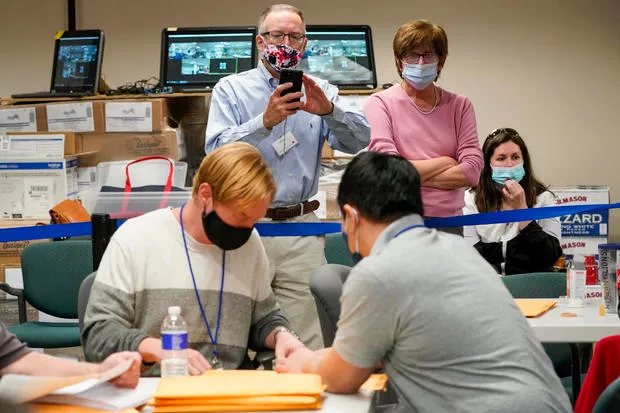 2020年11月6日,共和党监票员Ed White和民主党监票员Janne Kelhart在宾州艾伦镇计票中心监票。美联社拍摄 B 密歇根州底特律市TCF计票中心混乱 在另一个广泛流传的推特中,特朗普公布了一个视频,视频显示底特律的一个计票中心用大块纸板覆盖了窗户。