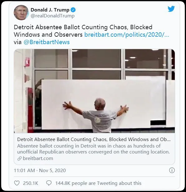 特朗普twitter显示底特律TCF计票中心的工作人员在用纸板阻挡外面人观看计票内部情况(https:///3ltx41V) 这并不是在阻止监票,计票中心内部已有足够的两党监票员。纸板是用来阻挡外部人员骚扰。